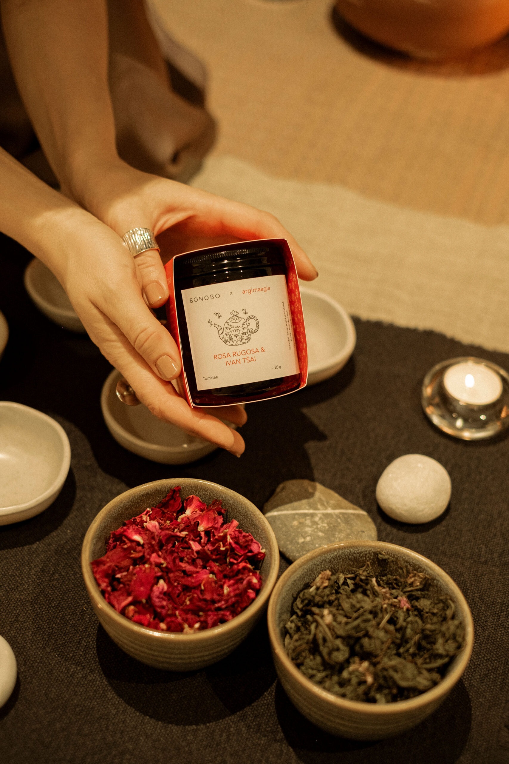 “Mina olen argimaagia ehk Pille Laiakask. Selle ilusa koostöö raames panin spetsiaalselt Bonobo jaoks kokku kolm ainukordset teesegu ja kolm küünalt. Valisin kevadel ja suvel kodumaa looduses rännates välja just need taimed, mis just praegu enim kõnetavad ning rõõmu ja tuge pakuvad. Kõik teed korjasin, kuivatasin ning pakendasin oma kätega punudes neisse sisse parimad kavatsused ja soovid. Loodan, et leiad siit endale sobiva tee erilisteks lihtsateks hetkedeks.”